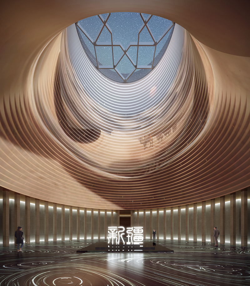 新疆非遗馆由华南理工大学何镜堂建筑创作院设计,中国工程院院士、华南理工大学建筑设计研究院有限公司首席总建筑师何镜堂介绍,新疆非遗馆设计风格体现的是中华文化的大气端庄,从空中鸟瞰,设计图上的非遗馆就像一幅壮丽的新疆非遗长卷,体现了“中华瑰宝·天圆地方”的设计概念,建筑采用中心对称式布局,代表着中华文化的凝聚与发扬,同时将观展和体验动静分区,满足多元化服务需求。馆中大堂有56个壁柱,寓意民族大团结。