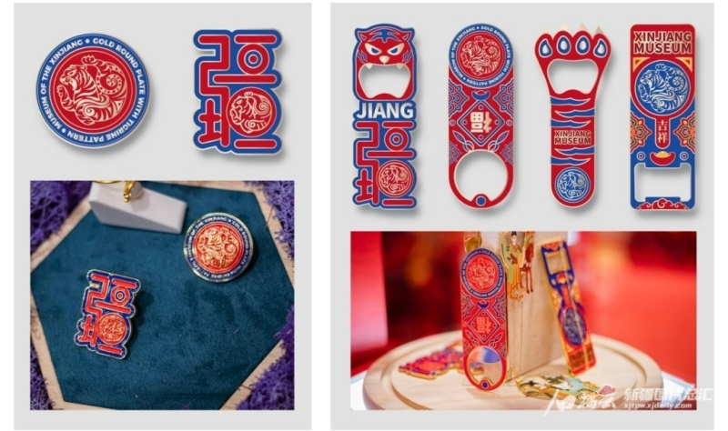 “潮虎想象”系列文创中的限定款徽章、冰箱贴、开瓶器。新疆博物馆供图