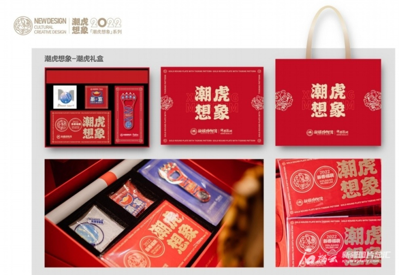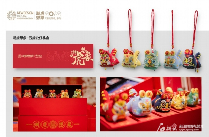 “潮虎想象”系列文创于2021年12月26日与大众见面,是以新疆博物馆馆藏一级文物——虎纹圆金牌为创作素材、以传统中国年为主题的文创产品,有折扇、口罩、钥匙扣、冰箱贴、红包套装、祈福香囊、新春福桶、新年徽章、新年抱枕等,共60多件(套)。