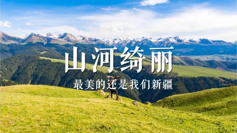 欢迎大家来到山河绮丽的新疆,在“最美的还是我们新疆”的欢快旋律中,感受新疆之“美”。大美新疆,是人们心中向往的“诗和远方”,一辈子一定要来一次,来一次就会记一辈子。春天的新疆是一支舞,娇艳多姿。那拉提空中草原泛出新绿、生机盎然,果子沟粉嫩的杏花漫山遍野、如梦如幻,巴音布鲁克大草原云海缥缈、群鸟飞翔,尽是“天山积雪初冻融”的温馨浪漫。夏天的新疆是一首歌,恢弘壮美。霍城薰衣草铺陈出紫色的海洋,昭苏油菜花翻滚着金色的波浪,泛舟天山天池,漫步赛里木湖,亲近喀纳斯湖,满目梦幻之蓝,沉醉人间仙境,尽是“山披彩裙地着纱”的五彩斑斓。秋天的新疆是一幅画,浓墨重彩。戈壁上、沙漠中、河流边,千年胡杨如诗如画;石榴树上、葡萄架下、苹果园里,各类瓜果芳香四溢;草场上、山谷间、村落旁,成群牛羊悠闲迈步,尽是“牧歌声声入云霞”的惬意悠然。冬天的新疆是一首诗,分外妖娆。在阿勒泰皑皑白雪中,滑雪者飞跃翻腾,在禾木古村落的篝火旁,游客们载歌载舞,尽是“莫言塞外风雪稠,自有美景比杭州”的静谧绝美。