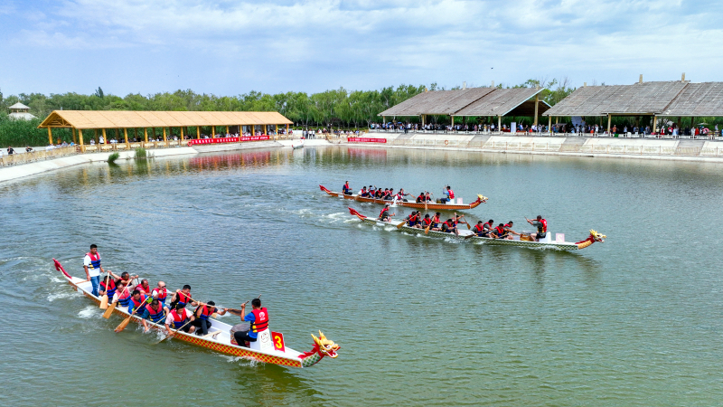 英吉沙县在南湖旅游度假区举行“‘粽’情过端午 ‘杏’福英吉沙”端午嘉年华系列文旅活动,来自全县14个乡镇和新疆生产建设兵团第三师图木舒克市东风农场的15支龙舟队,上演“速度与激情”,队员紧跟鼓点节拍在湖中挥桨劈浪,现场观众欢呼声、呐喊声不绝于耳。