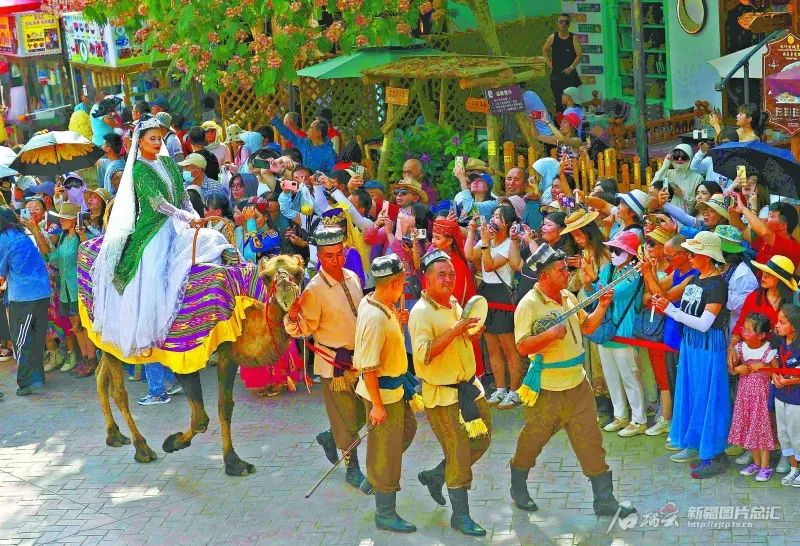 7月5日,游客在喀什古城景区欣赏“丝路驼队”巡游。阿地力江·阿不都卡德尔摄