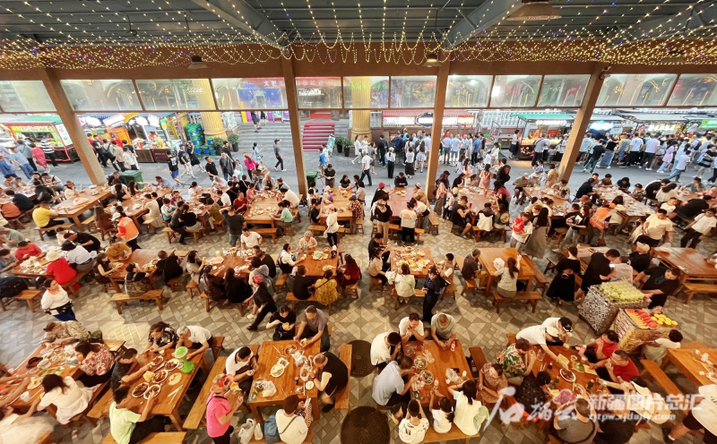 7月4日晚,市民和游客在新疆国际大巴扎景区大巴扎美食街品尝美食,美食街上人声鼎沸,酸奶粽子、烤全羊等上百种各色美食让食客们赞不绝口。石榴云/新疆日报记者约提克尔·尼加提摄