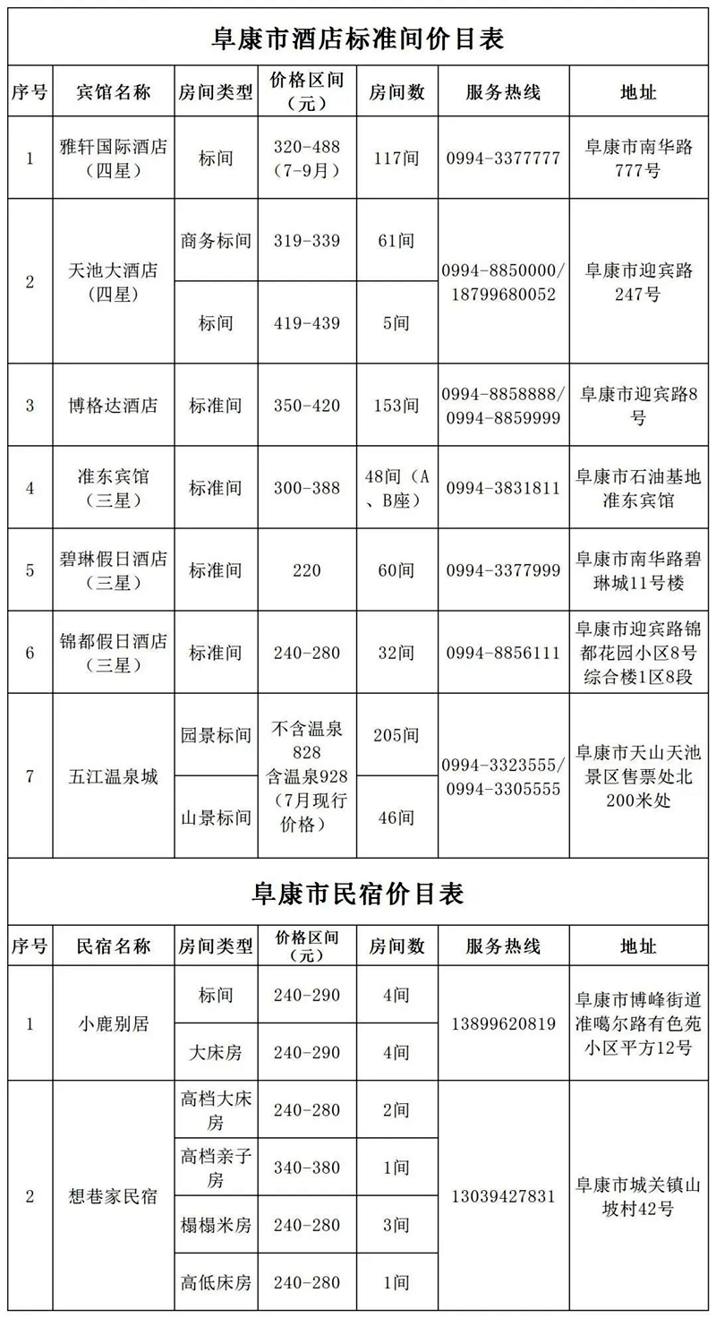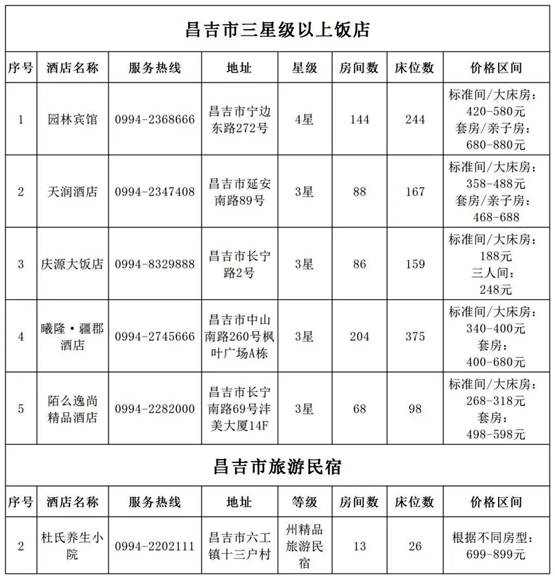 为规范昌吉州旅游行业经营行为,维护旅游市场价格秩序,保障经营者和消费者双方合法权益,营造舒心出行、放心消费的市场环境,依据《中华人民共和国价格法》《价格违法行为行政处罚规定》《明码标价和禁止价格欺诈规定》等法律法规,多措并举平抑市场价格,现将昌吉州各县市宾馆酒店、民宿、农家乐市场价格公布如下: