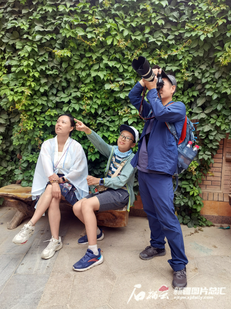 7月9日,来自上海的严逸凡小朋友和父母在和田团城旅游,他让爸爸多拍点照片留念。石榴云/新疆日报记者 白素君摄