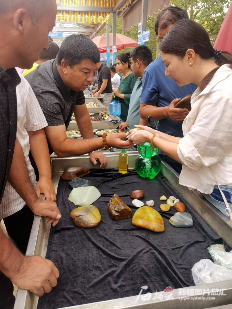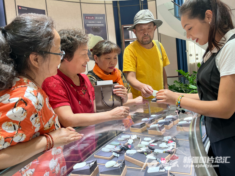 7月9日,在和田玉石交易中心,顾客们在选购玉器。石榴云/新疆日报记者 白素君摄