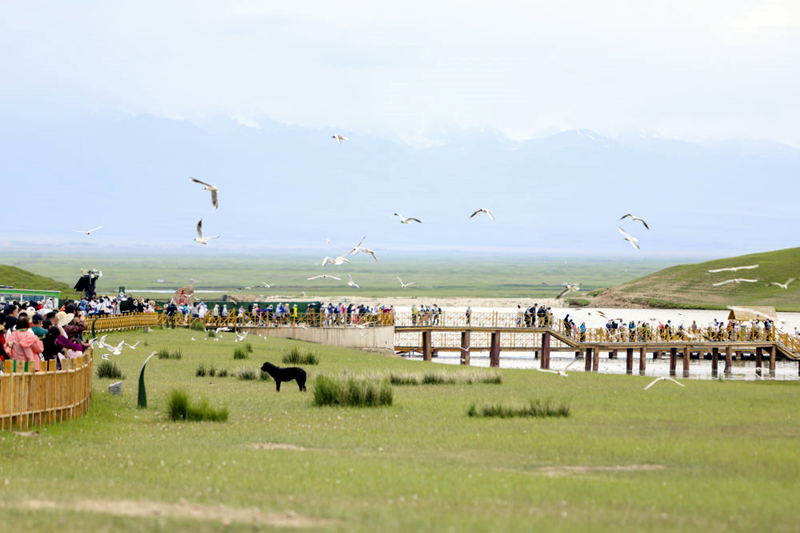 7月6日,游客在巴音布鲁克天鹅湖景区参观。 新华社记者郝昭 摄