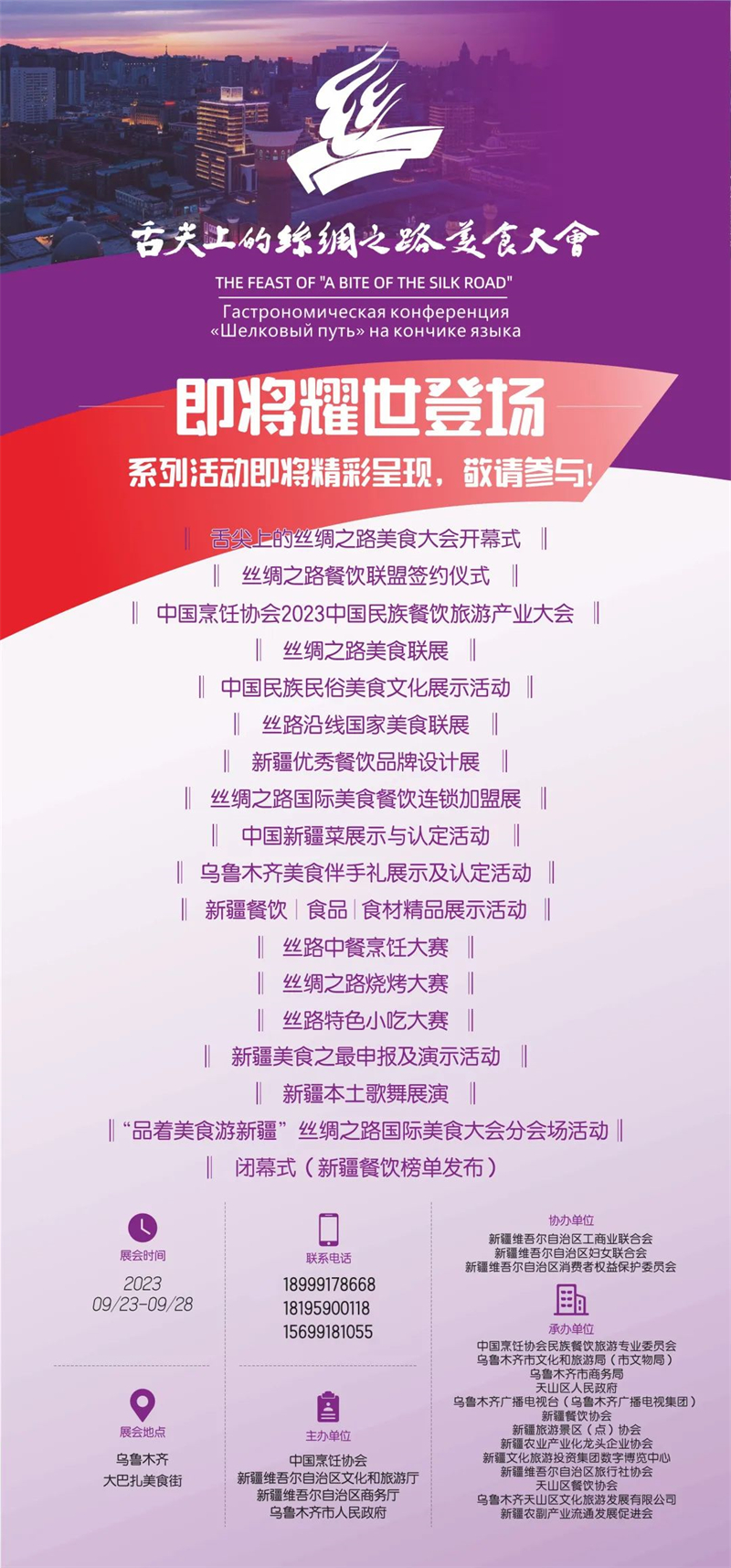 2023舌尖上的丝绸之路美食大会,9月23日至28日在新疆国际大巴扎美食街举行。本届美食大会由中国烹饪协会、新疆文化和旅游厅、自治区商务厅、乌鲁木齐市人民政府共同主办。
