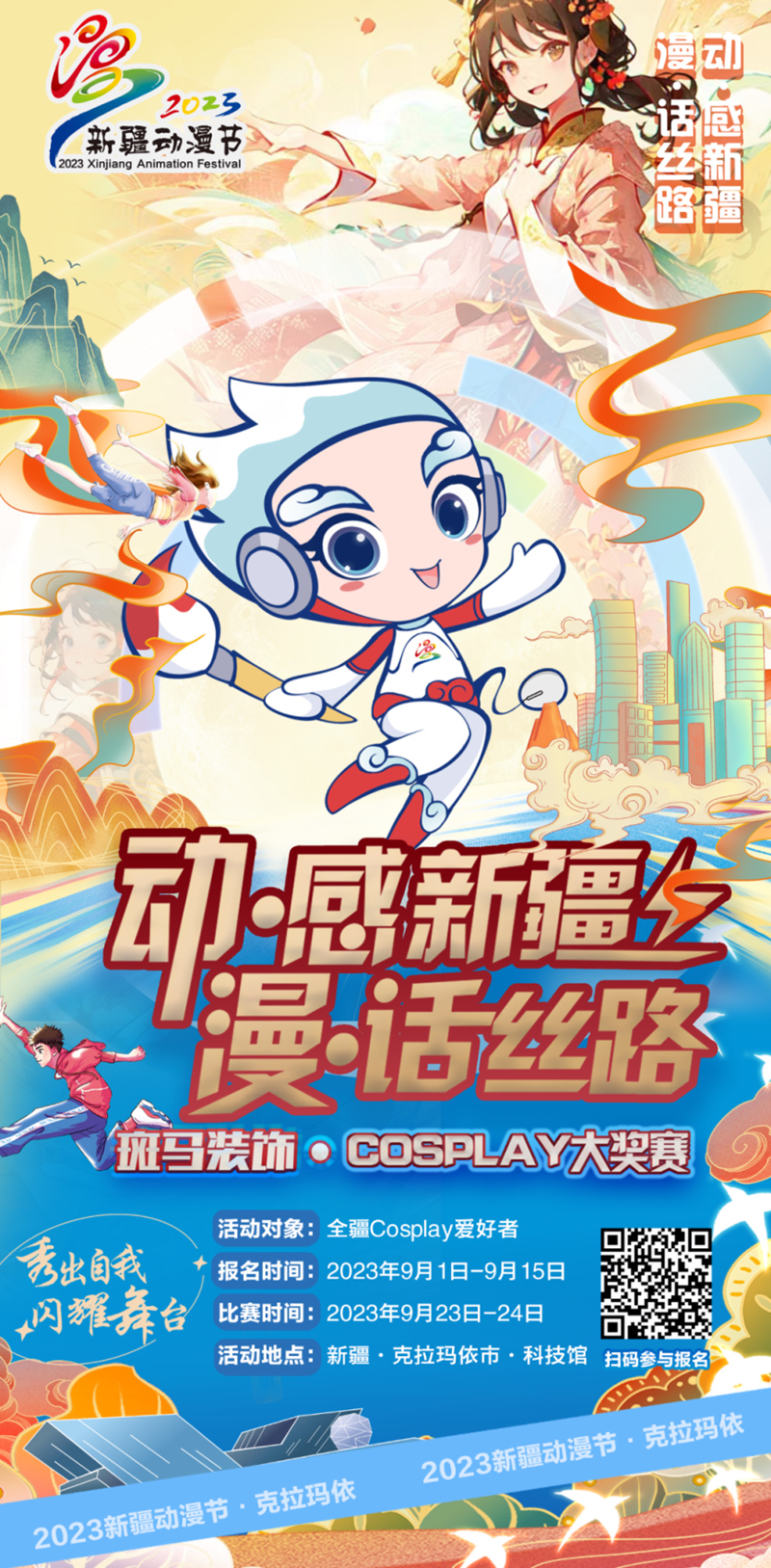 “作为2023新疆网络文化节重点项目,本届新疆动漫节将进行全面升级,打造更为具象化的场景空间,确保人气流量和专业水平,让更多游客和漫迷沉浸其中,感受动漫世界。”该活动承办方相关负责人介绍,除了动漫交流沙龙、优秀动漫作品展映、“喜迎国庆 美丽新疆”现场绘画大赛、廉政漫画作品展、古风换装体验活动、创意手工制作、文创集市等精彩内容外,本届新疆动漫节还推出了以“动·感新疆 漫·话丝路”为主题的“Cosplay大奖赛”,通过情景化呈现和“国潮”风格的个性化演绎,激发国漫IP活力,给动漫舞台更多创新表达的方式。