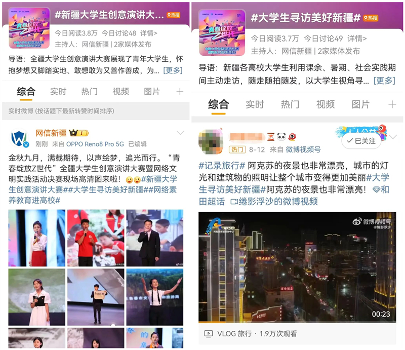 青春绽放Z世代”全疆大学生创意演讲大赛暨网络文明实践活动于今年6月启动。第一阶段“大学生寻访真实美好新疆”活动于7至8月开展,全疆各高校组织大学生开展了形式多样的寻访美好新疆网络文明实践活动,通过抖音、微博平台开设“大学生寻访美好新疆”“新疆大学生创意演讲大赛”等话题,以大学生视角讲好新疆故事,唱响网上好声音,传播网络正能量。