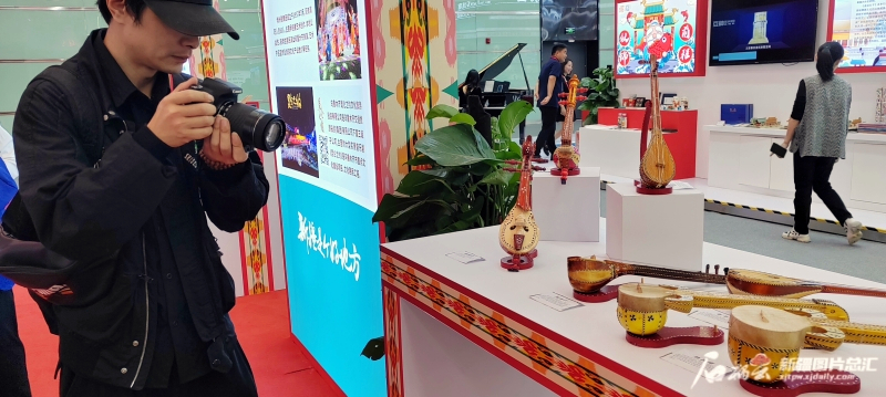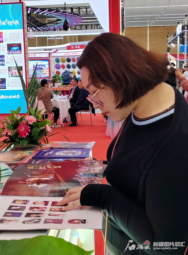 现场展示的“迷你版”胡西塔尔、弹布尔、冬不拉等新疆乐器,“五星出东方”系列手包、丝巾、鼠标垫、行李牌,《昆仑之约》明信片、U盘等文创产品,吸引不少观众的目光。新疆馆内,许多参展商和专业观众专门来到这里,询问各类演出情况并留下资料,一些省市的演员主动和新疆演员交流合影,“歌舞之乡”魅力尽展。