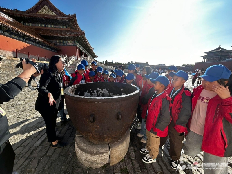 9月30日,故宫讲解员为孩子们介绍铜缸的作用。 石榴云/新疆日报记者 张小宓摄
