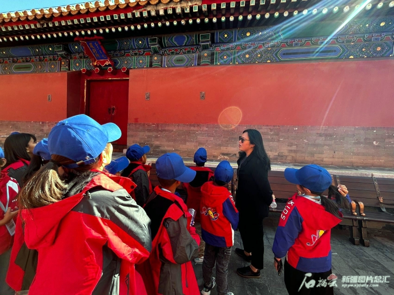 9月30日,故宫讲解员为孩子们介绍故宫的建筑。石榴云/新疆日报记者 张小宓摄