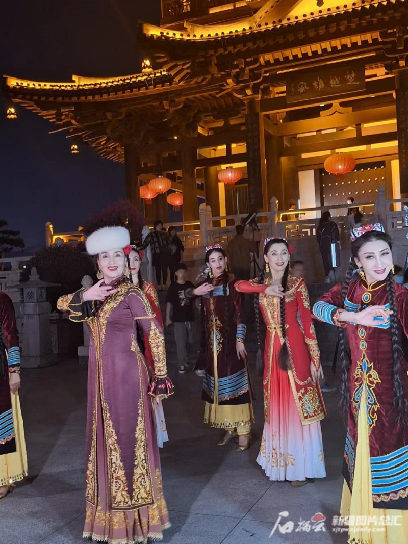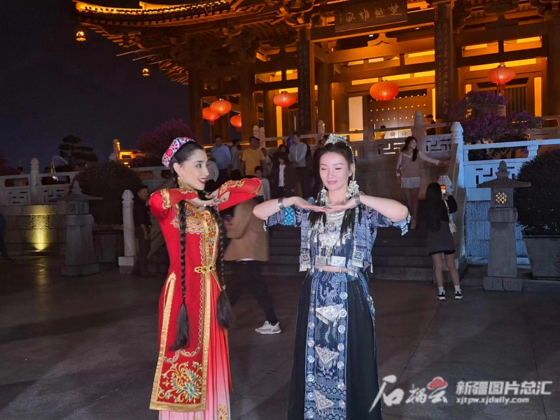 身着苗族服饰来逍遥楼拍夜景的桂林市民杨斯羽,跟着木卡姆艺术团的演员学起了新疆舞。石榴云/新疆日报记者玛依古丽·艾依提哈孜 摄