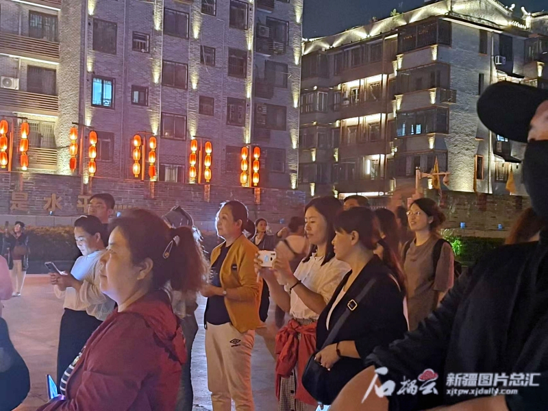 载歌载舞的热烈氛围,感染了现场观众,纷纷跟着音乐节奏鼓掌,叫好声不断,许多人忍不住和演员共同舞动起来。“舞姿优美,服装靓丽,很向往去新疆旅游。”身着苗族服饰来逍遥楼拍夜景的桂林市民杨斯羽趁表演间隙,拉着木卡姆艺术团的演员学起了新疆舞。