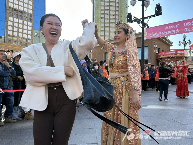 10月16日12时,新疆国际大巴扎景区热闹的开街仪式,吸引众多市民及游客围观。伴随着美妙的音乐,身着华丽服饰的演员们跳起优美的舞蹈,来自江苏的游客周芷阳拿起手机不停拍照。她说,大巴扎建筑风格极具特色,这次和朋友一起来新疆旅游,这是第一个打卡地。