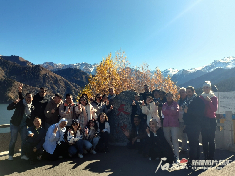 10月25日,2023青年汉学家研修计划新疆班学员们在天山天池拍照留念。石榴云/新疆日报记者李莉摄