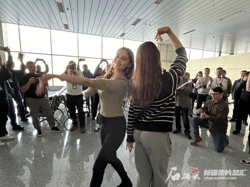 乌鲁木齐地窝堡国际机场候机厅里,演员们自发跳起了舞蹈。石榴云/新疆日报记者 阿比拜摄