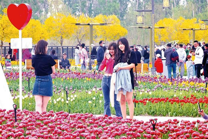 在位于六师五家渠市的青格达湖旅游风景区郁金香园,游客拍照打卡(资料图片)。 李华北 摄