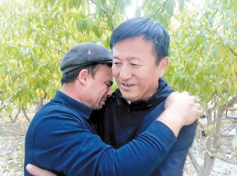 张汉英(右)与队员一同看望帮扶的村民,临走时,买合木提·吾杰(左)与张汉英依依惜别(摄于10月15日)。 张新慧 摄