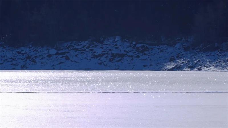 茫茫大雪中,池水在一片雪景中幻化出光彩。