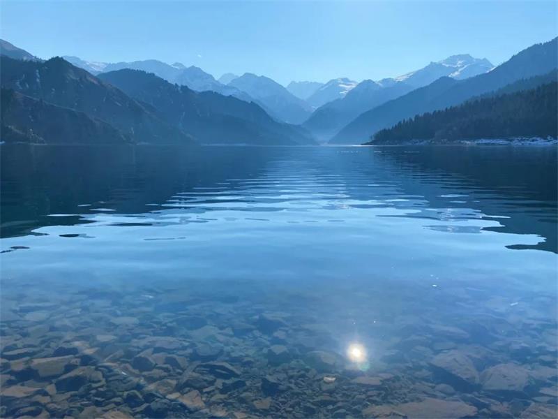 湖面清澈明净,像一块晶莹透亮的水晶石,翠蓝清绿,又好似一块无暇的翡翠。
