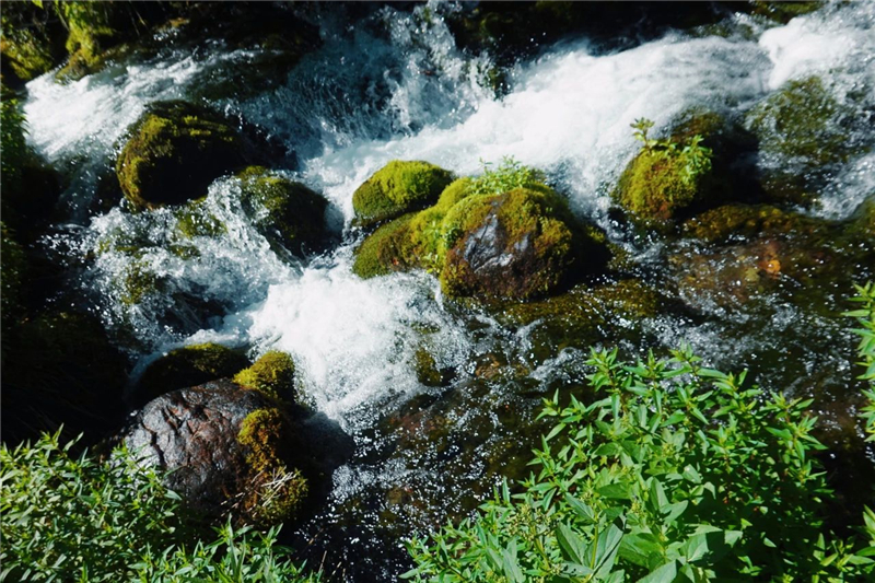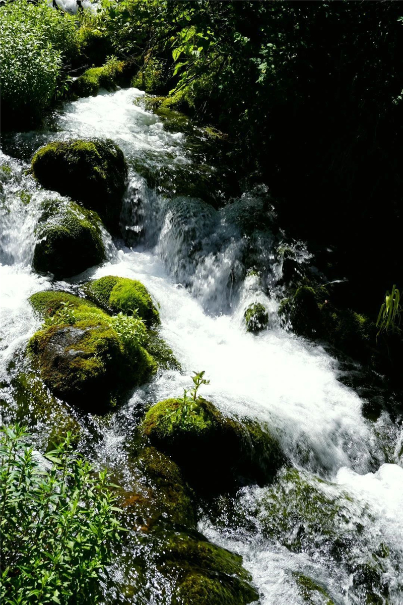泉水从高处崖壁间飞流直下,经过高低错落的岩石,穿过层叠起伏的苔藓,飞瀑流泉、碧水深藏,令人心生喜爱。