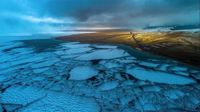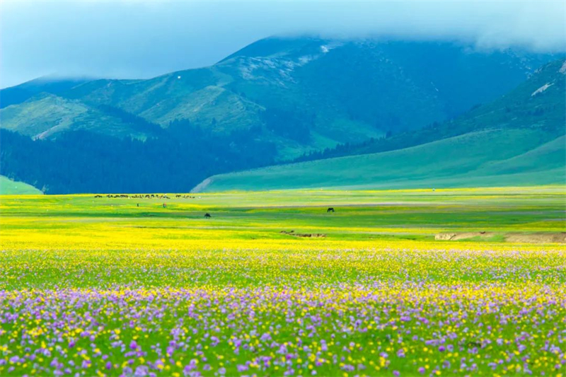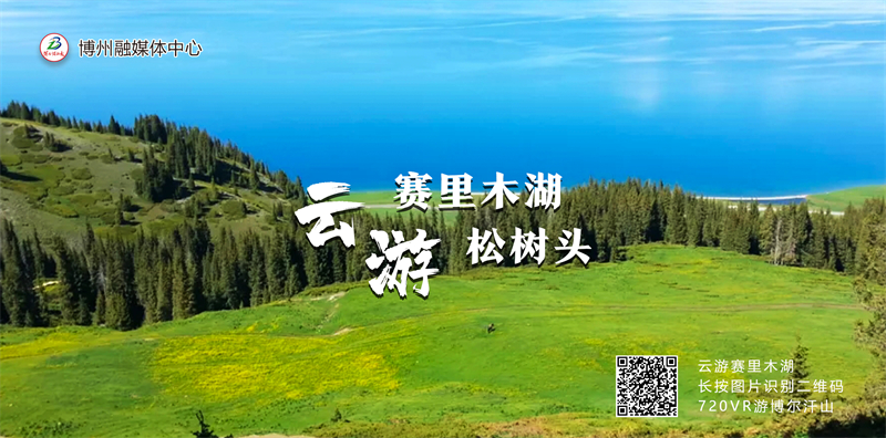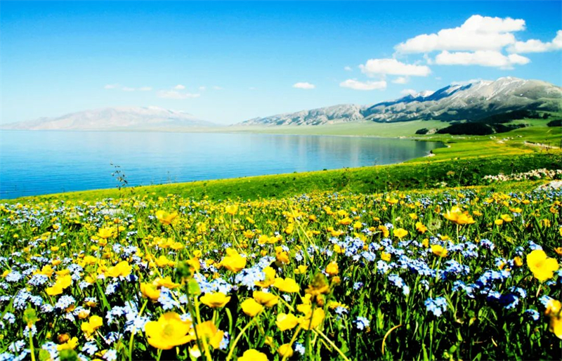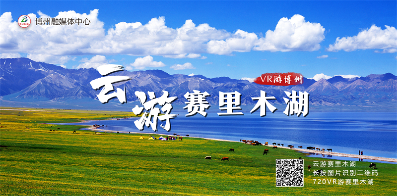 湖畔林茂涧清,草深花繁,辽阔的草原上,毡房星点。炊烟袅袅,奶茶飘香,千万只洁白的绵羊在草场上涌动,犹如蓝天上的朵朵白云,牧马奔驰,牛驼踱步,构成了一幅静谧、温馨、粗犷深远、如诗如画的牧场风物画。