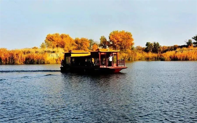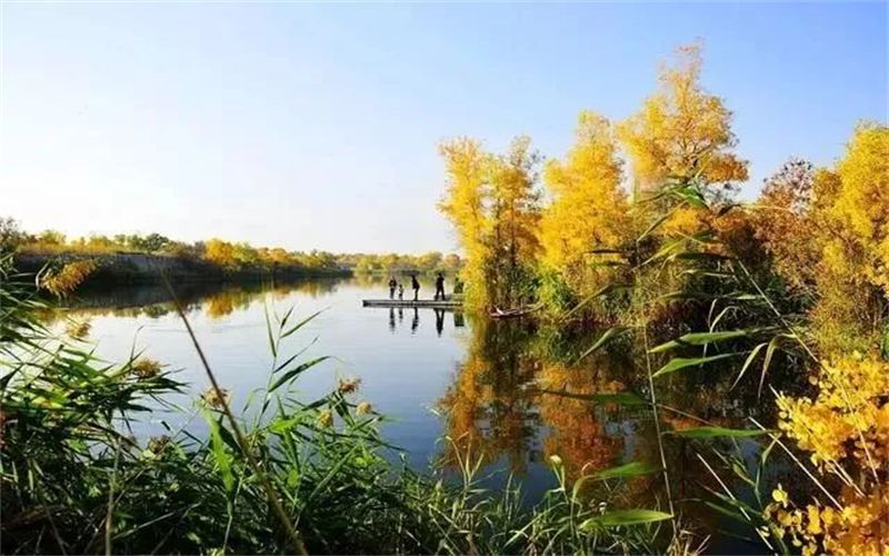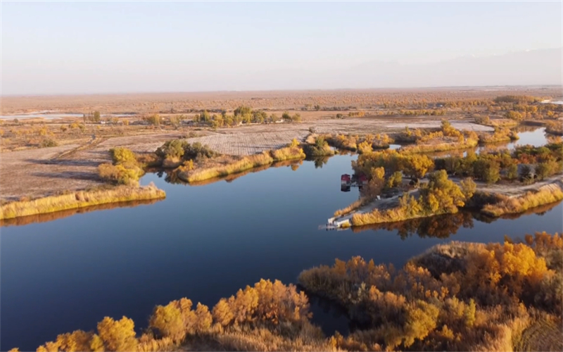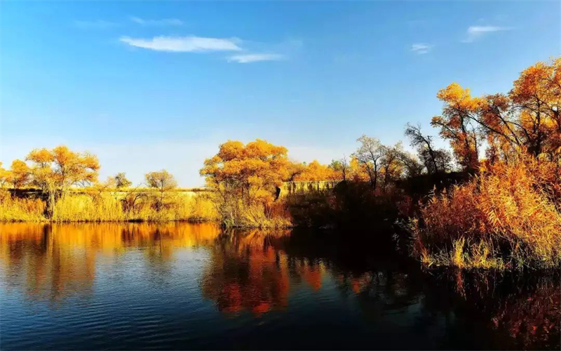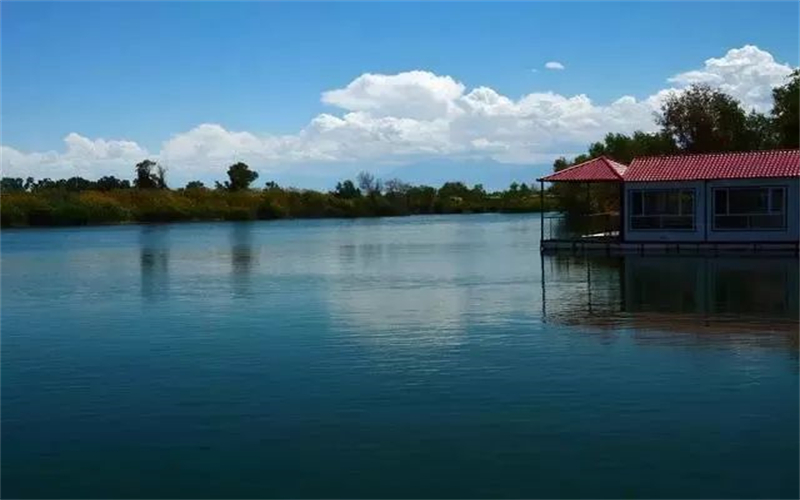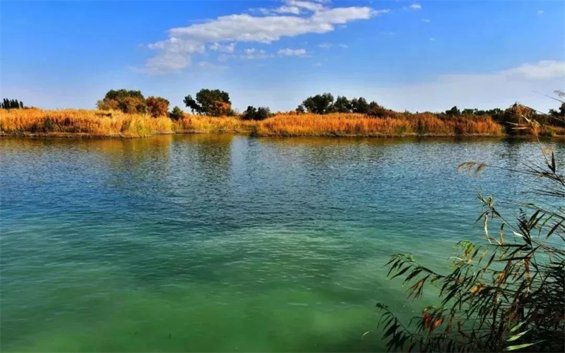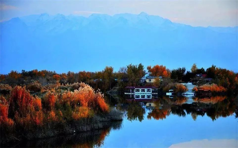 克孜加尔湖周围茂密的芦苇、金黄的胡杨、挺直高大的白杨、树叶婆娑的沙枣、粉红色的红柳环绕四周,湖光山色交相辉映,整个湖面犹如一幅天然绝伦的油画。身临其境,仿佛置身于人间仙境、世外桃源。