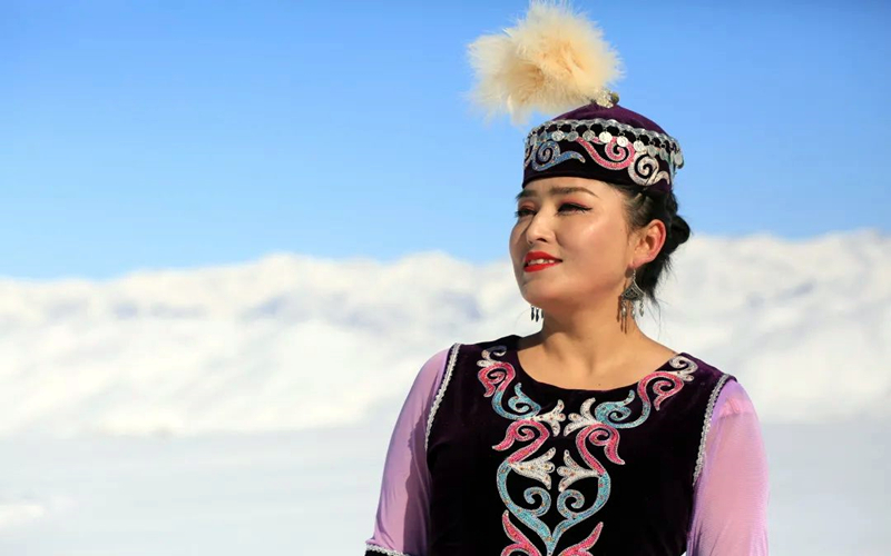 俊俏的哈萨克姑娘身穿五彩花裙