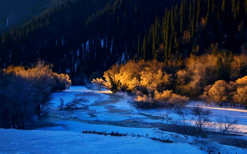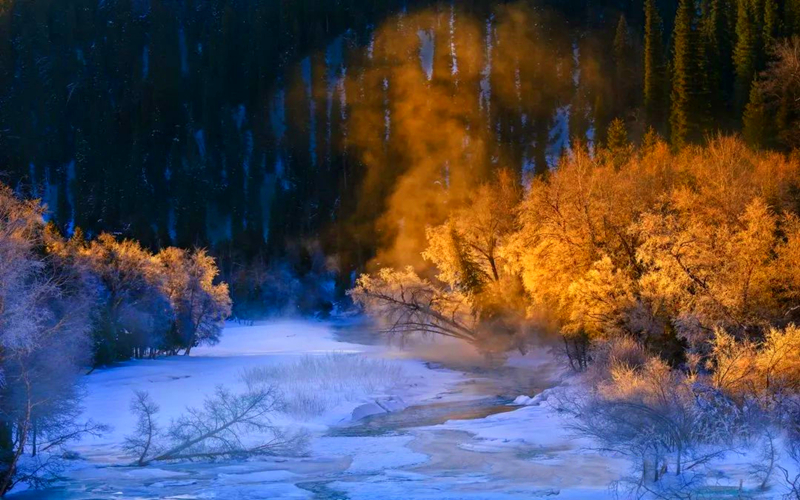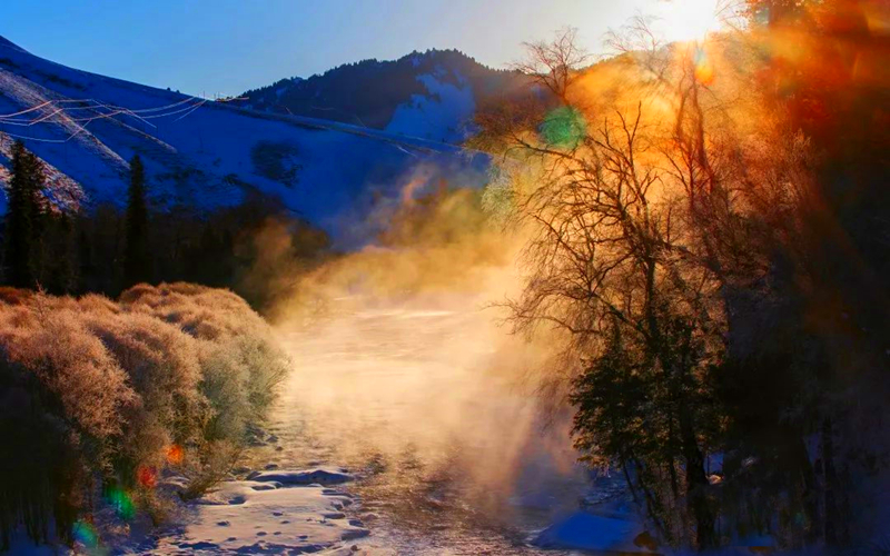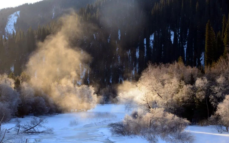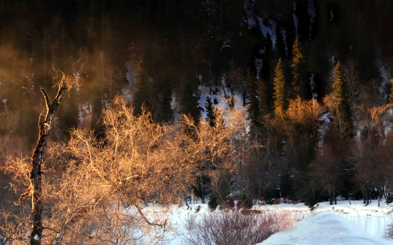 一轮红日把万道霞光撒向那拉提,放眼四周,树已被金色晨光所晕染,只见一片红装素裹的景象。