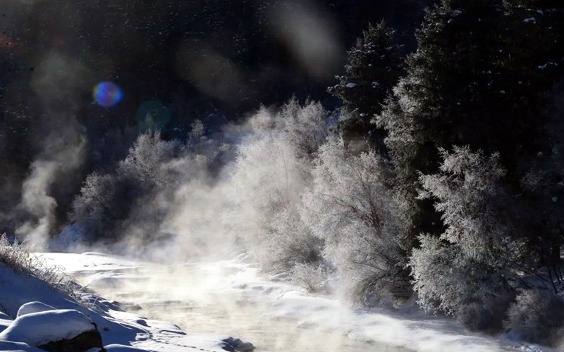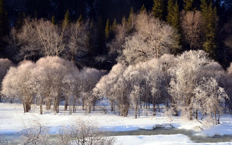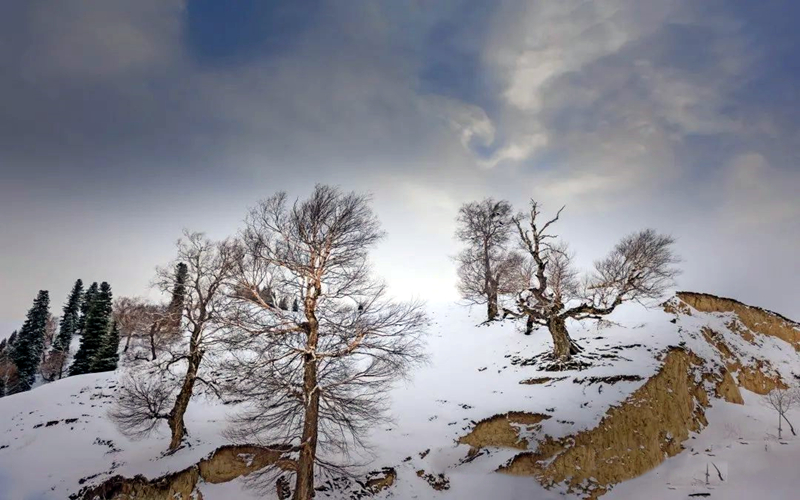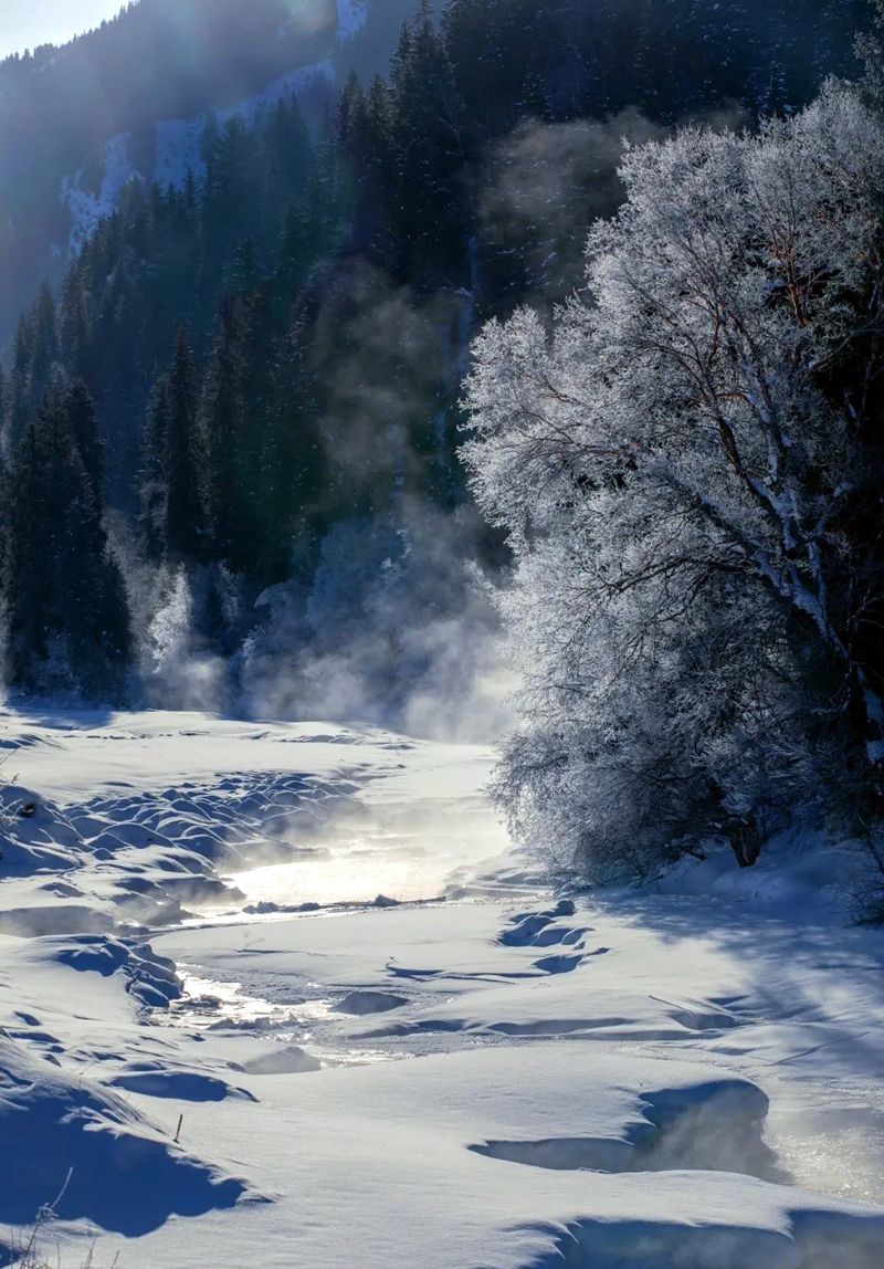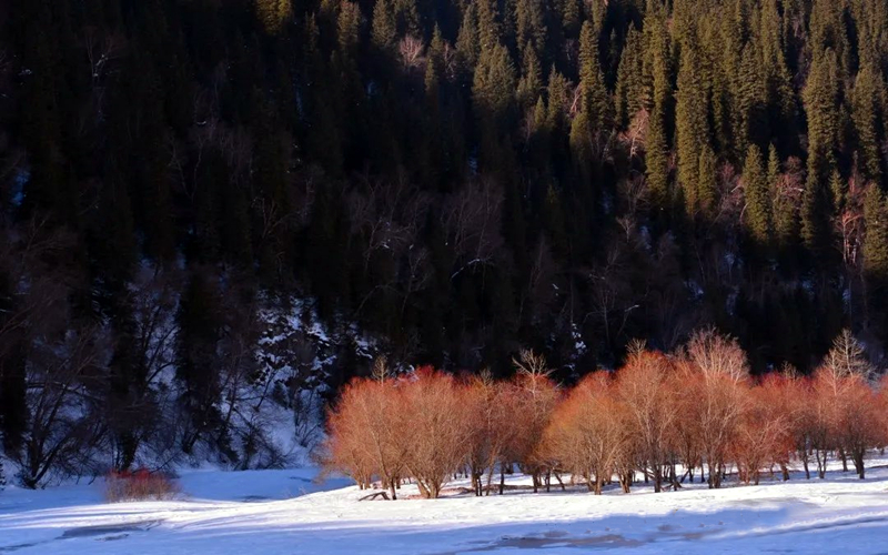 在辽阔的那拉提大草原,冬日的大雪尘封了草原夏秋丰硕的色彩,被一大片松柏所装饰,美如仙境,令人陶醉,白雪与苍翠的松柏点缀着这片草原,交相辉映,更显雄伟壮观。