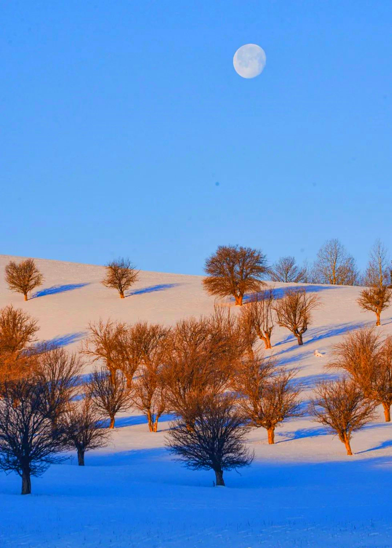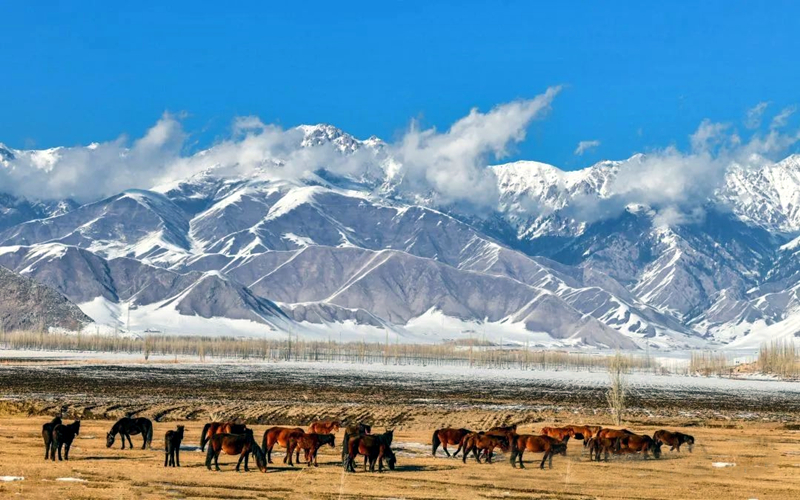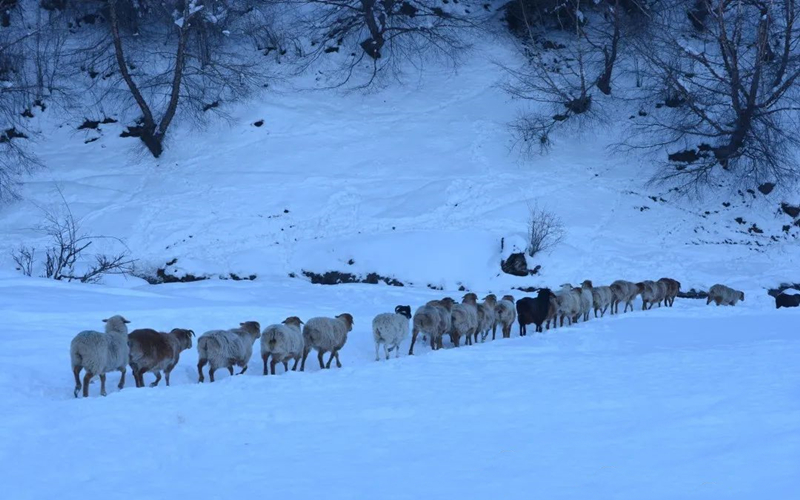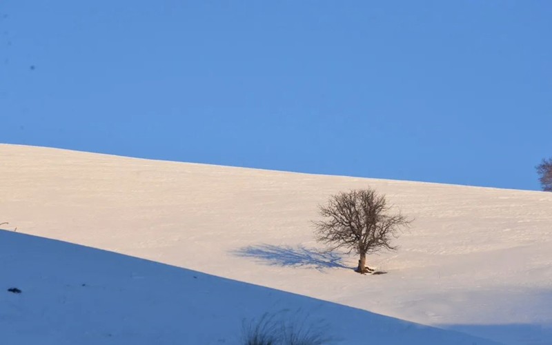 雪后的那拉提草原银装素裹,空气清新,在蓝天白云下,马牛羊在雪地里悠闲吃草,羊儿在回家路上,别具一番韵味,犹如一幅展开的水墨画卷,美不胜收。