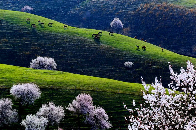 草原的新绿搭配杏花的粉嫩,再点缀以牧民的毡房和悠闲的牛羊,春色就这样被演绎得恰到好处。