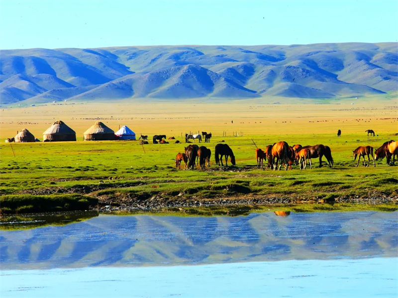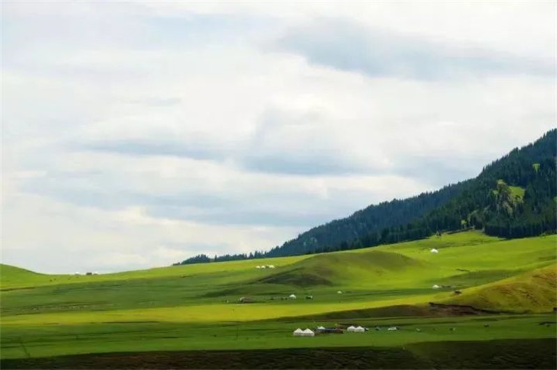 沙孜草原天空湛蓝、绿草如茵、牛羊如云、毡房点点,仿佛是大自然描绘的一幅多彩油画,令人沉醉。