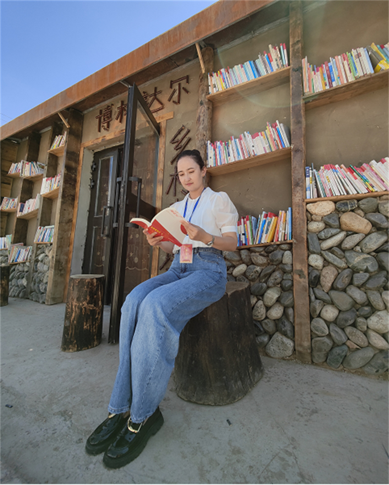 沙雅县文体广旅局局长热娜古丽·热合曼在博格达尔乡村书屋前阅读