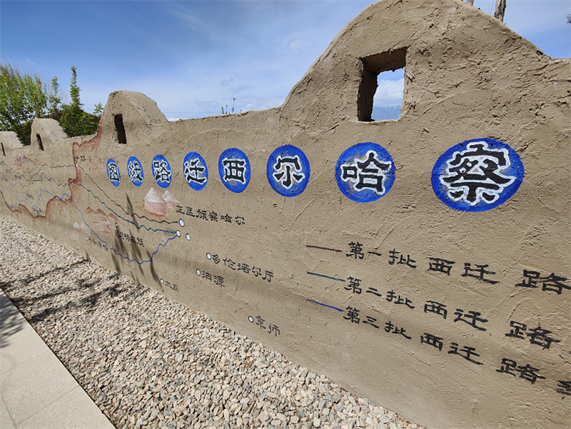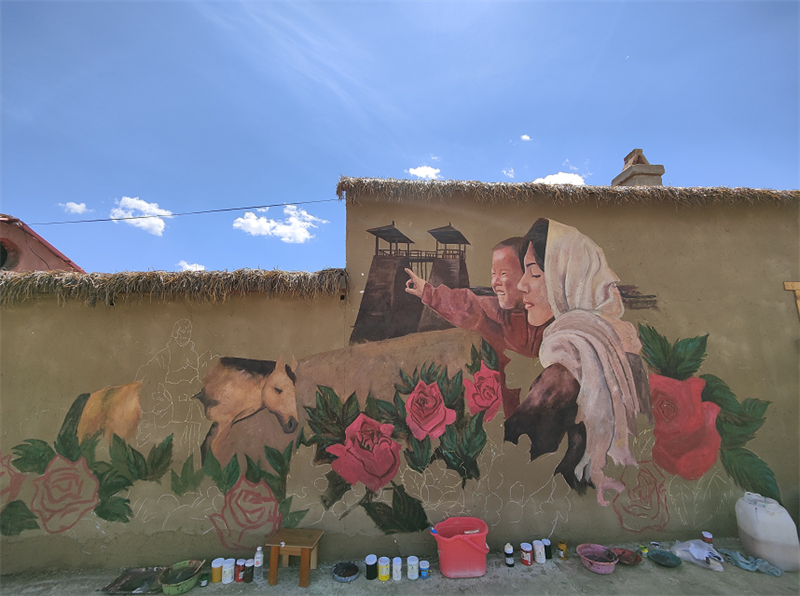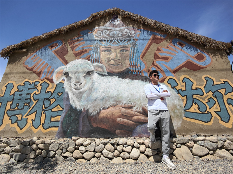 塔什库尔干塔吉克自治县文体广旅局副局长阿力甫·阿克木汗在彩绘墙前打卡拍照
