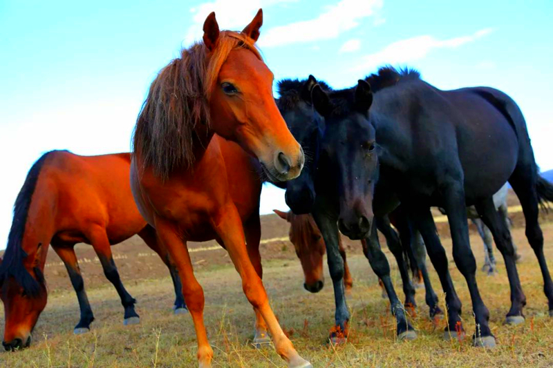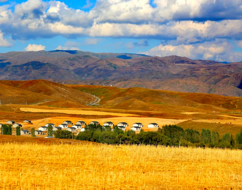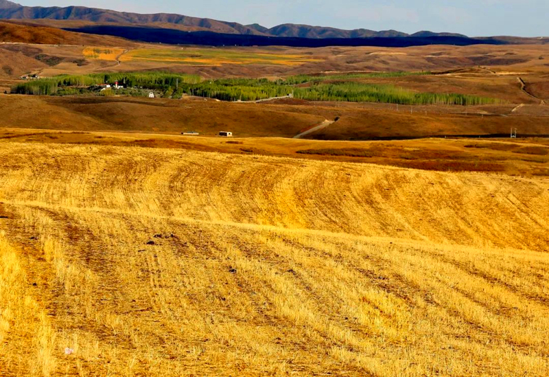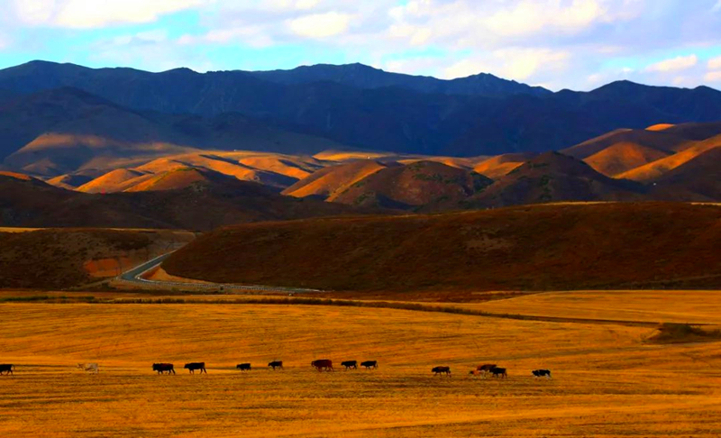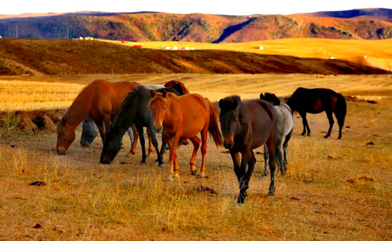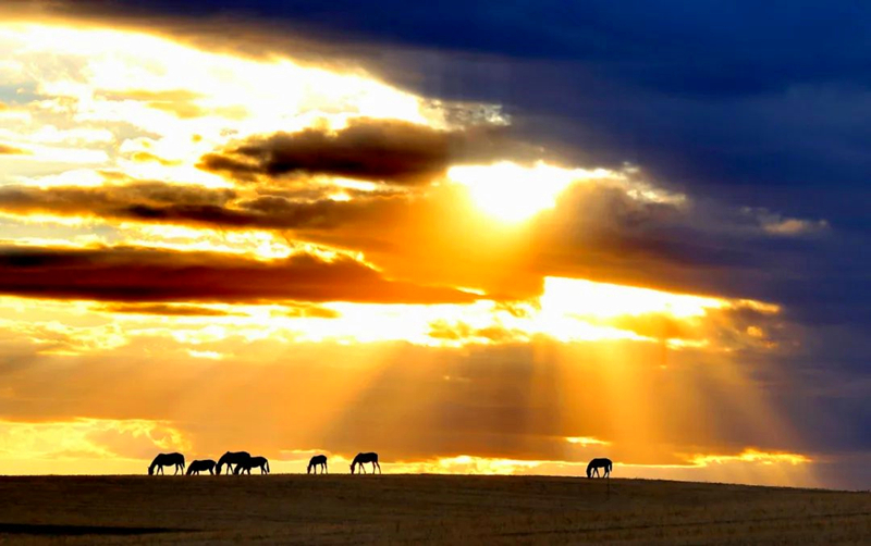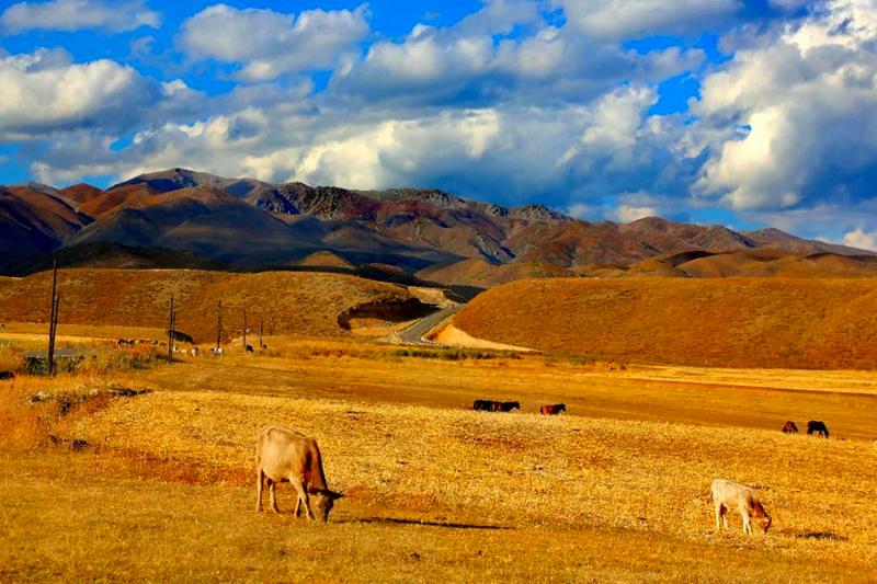 秋天的塔尔巴哈台山是颜色的世界,大自然将各种花草树木,五彩缤纷地汇集到了这里,红的似火、黄的流金,如诗如画。山中的铁列克提草色逐渐变为迷人的金黄色,夕阳下,溢彩留香、色彩斑斓,加上牛羊和骏马的加入,犹如一幅绚丽多彩的画卷。