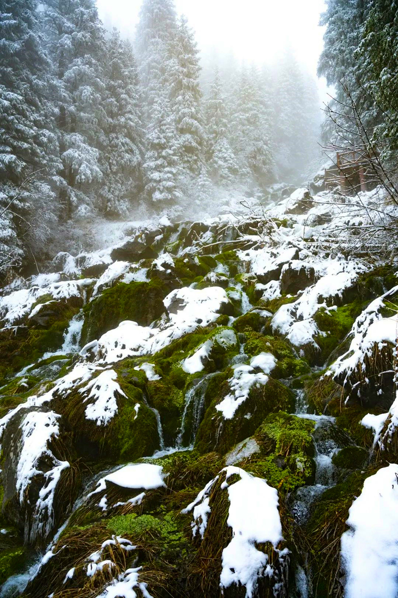 而天山天池的冬天,总能让人达成所愿。一到冬天,时不时漫天的鹅毛大雪,将整个世界都染成白色,却在白色里构出一道道绝美的风景线。
