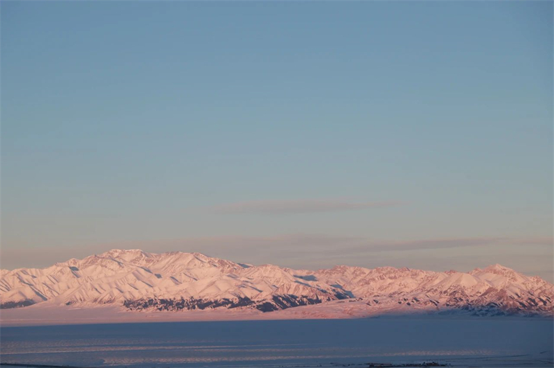 只要是晴天,赛里木湖的日出和日落前,天空都是非常梦幻的粉蓝色彩带,山被照得是通体粉红色,超美!