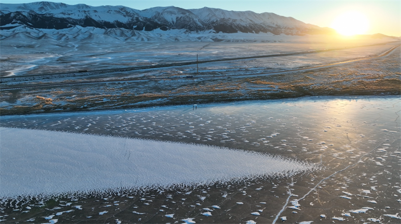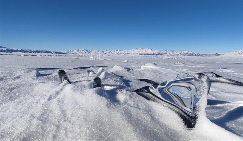 冬天的赛里木湖,大部分水面都是冻住的,全都是蓝冰。但如果下过雪,雪遮住冰面,蓝冰就需要好好找一下。比较方便的位置是从月亮湾下车,穿过UTV(全地形越野车)的场地,往湖中心走大约15分钟。