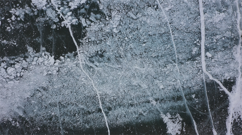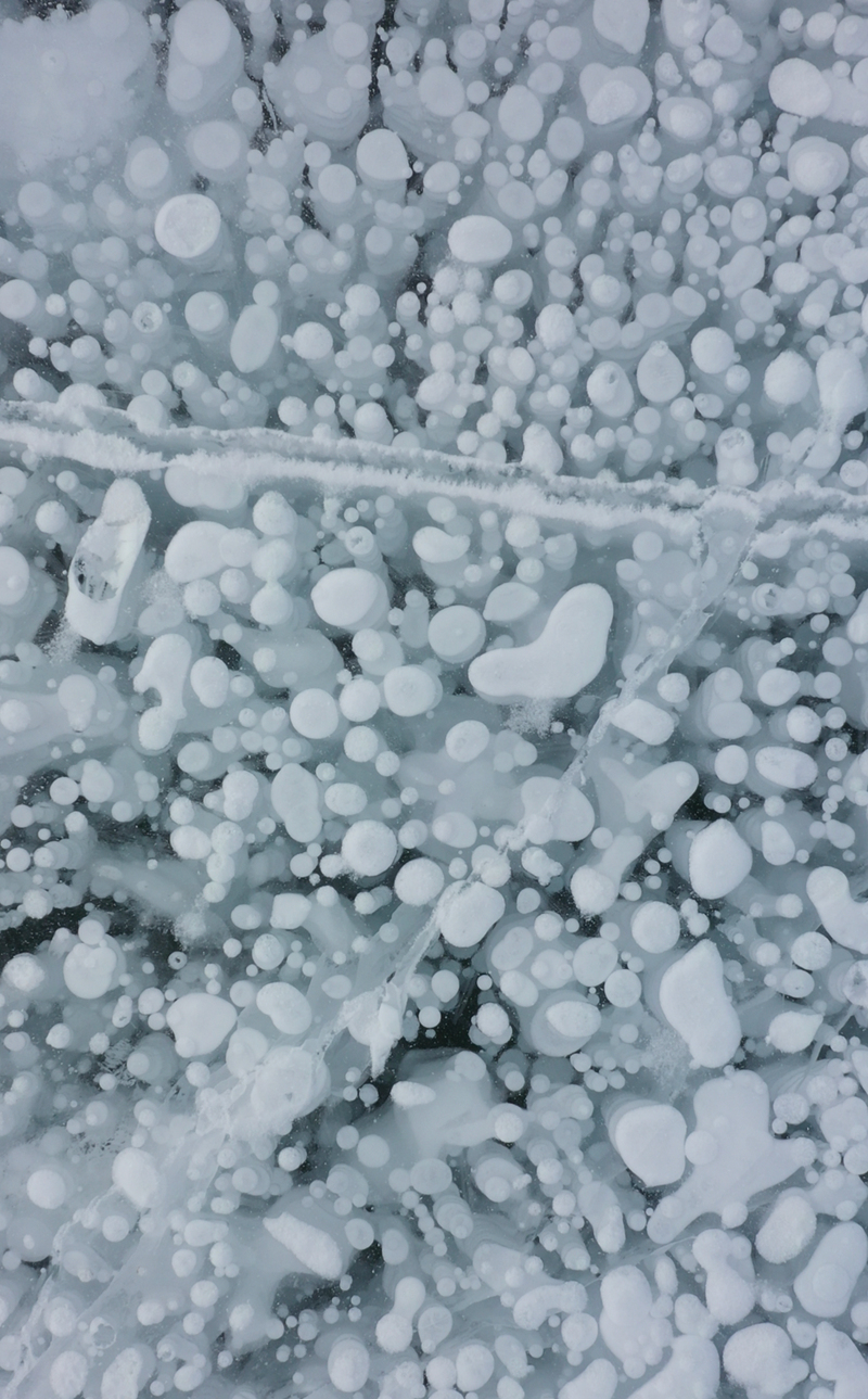 冰泡位置从南门往东门走,大约中间位置,看见大片芨芨草的地方就到了。手机可能比相机拍得更清楚。冰泡就像很多雪白的水蘑菇漂浮在冰面里。冰面很透,像镜子,冰泡很可爱。