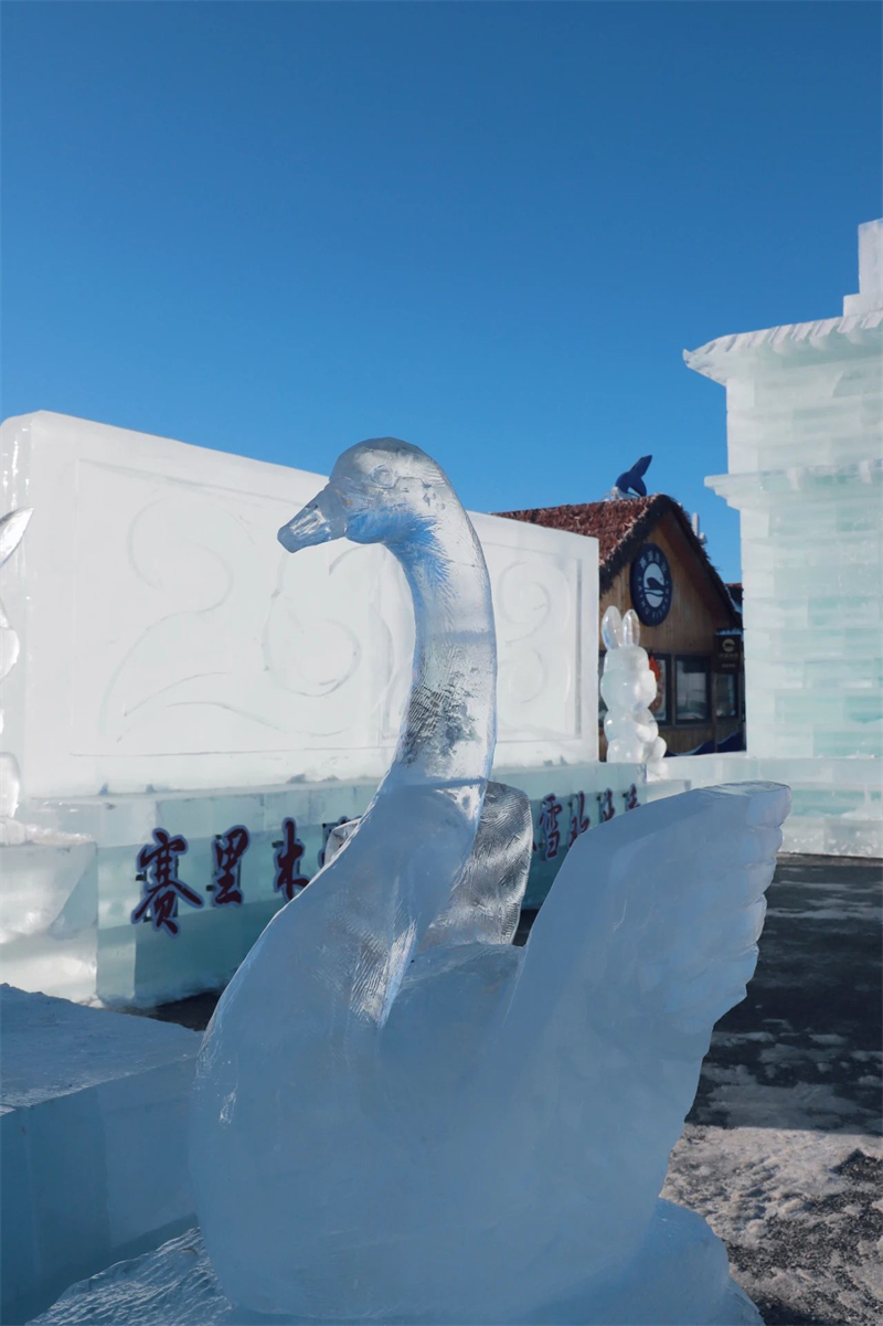 可爱的天鹅和小兔子冰雕也太迷人了,透光度很高,像琉璃似的。在蓝天和阳光下拍出来极美。