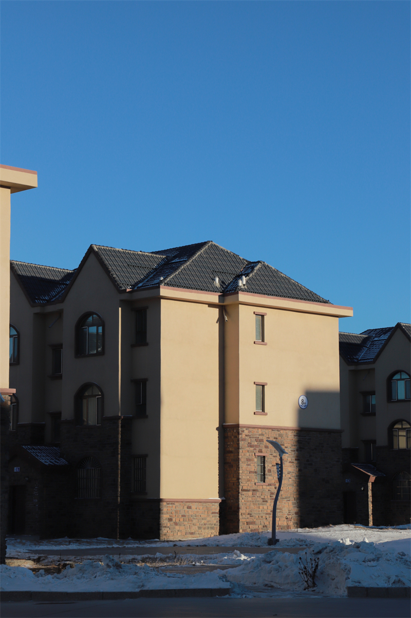 一栋栋小楼构成的公寓式酒店,装修风格温馨。景区晚上再冷也不怕,房间有地暖,很暖和。酒店大厅在院子不远处,一楼是前台、商店,二楼是餐厅,有简单的自助餐,也能点菜。