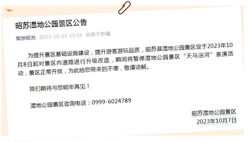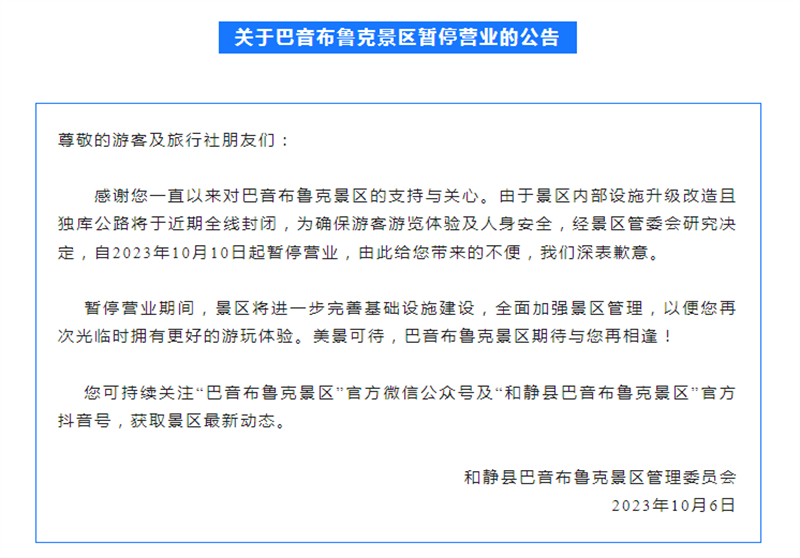 10月6日,和静县巴音布鲁克景区管理委员会发布《关于巴音布鲁克景区暂停营业的公告》,由于景区内部设施升级改造,为确保游客游览体验及人身安全,经景区管委会研究决定,自2023年10月10日起暂停营业。