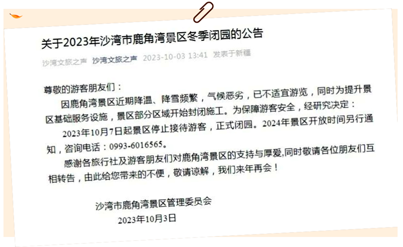 10月3日,沙湾市鹿角湾景区管理委员会发布《关于2023年沙湾市鹿角湾景区冬季闭园的公告》。因鹿角湾景区近期降温、降雪频繁,天气恶劣,已不适宜游览,同时为提升景区基础服务设施,景区部分区域开始封闭施工。为保障游客安全,经研究决定:2023年10月7日起景区停止接待游客,正式闭园。2024年景区开放时间另行通知。