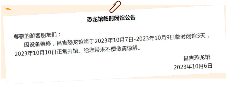 昌吉恐龙馆于10月6日发布《恐龙馆临时闭馆公告》,因设备维修,昌吉恐龙馆将于10月7日-10月9日临时闭馆3天,10月10日正常开馆。