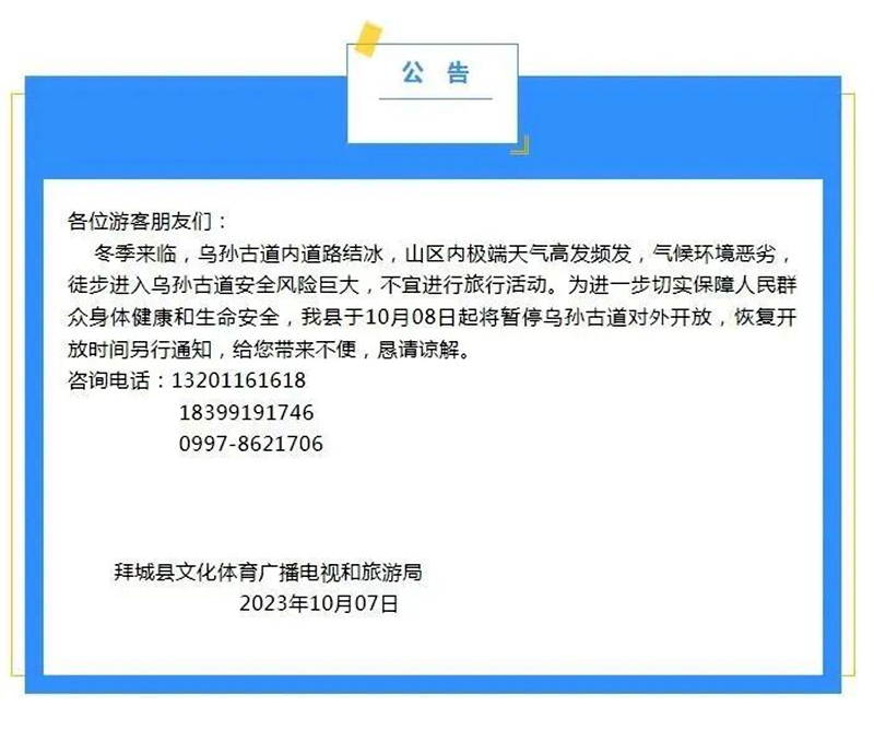 10月7日,拜城县文化体育广播电视和旅游局发布《关于对阿克苏地区拜城县乌孙古道关闭的公告》。冬季即将来临,乌孙古道内道路结冰,山区内极端天气高发频发,气候环境恶劣,徒步进入乌孙古道安全风险巨大,不宜进行旅行活动。为进一步切实保障人民群众身体健康和生命安全,拜城县于10月8日起将暂停乌孙古道对外开放,恢复开放时间另行通知,给您带来不便,恳请谅解。