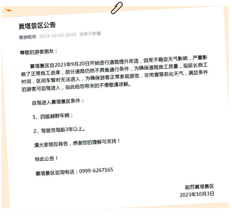 10月3日,昭苏夏塔景区发布景区最新公告。夏塔景区自2023年9月20日开始进行道路提升改造,因受不稳定天气影响,严重影响了正常施工进度,部分道路仍然不具备通行条件,为确保道路施工质量,现延长施工时间,区间车暂时无法进入,为确保游客正常参观游览,非雨雪等恶劣天气,满足条件的游客可自驾进入。