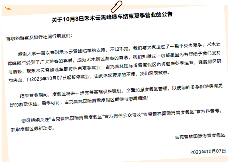 10月7日,喀纳斯景区发布《禾木云霄峰缆车结束夏季营业的公告》。禾木云霄峰缆车即将结束夏季营业,吉克普林国际滑雪度假区也将迎来冬季运营。